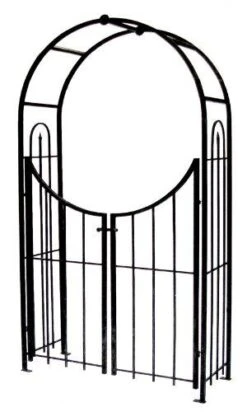 The support rod at the apex of the arch has a floral finial, offering a bit more detailing. For more excitement, the included gate panels curve downward to create a circle when the gate is closed. The steel construction is sturdy and hard-wearing, and the black finish is powder coated for longevity. This finish will give the arbor a distinguished look year after year.